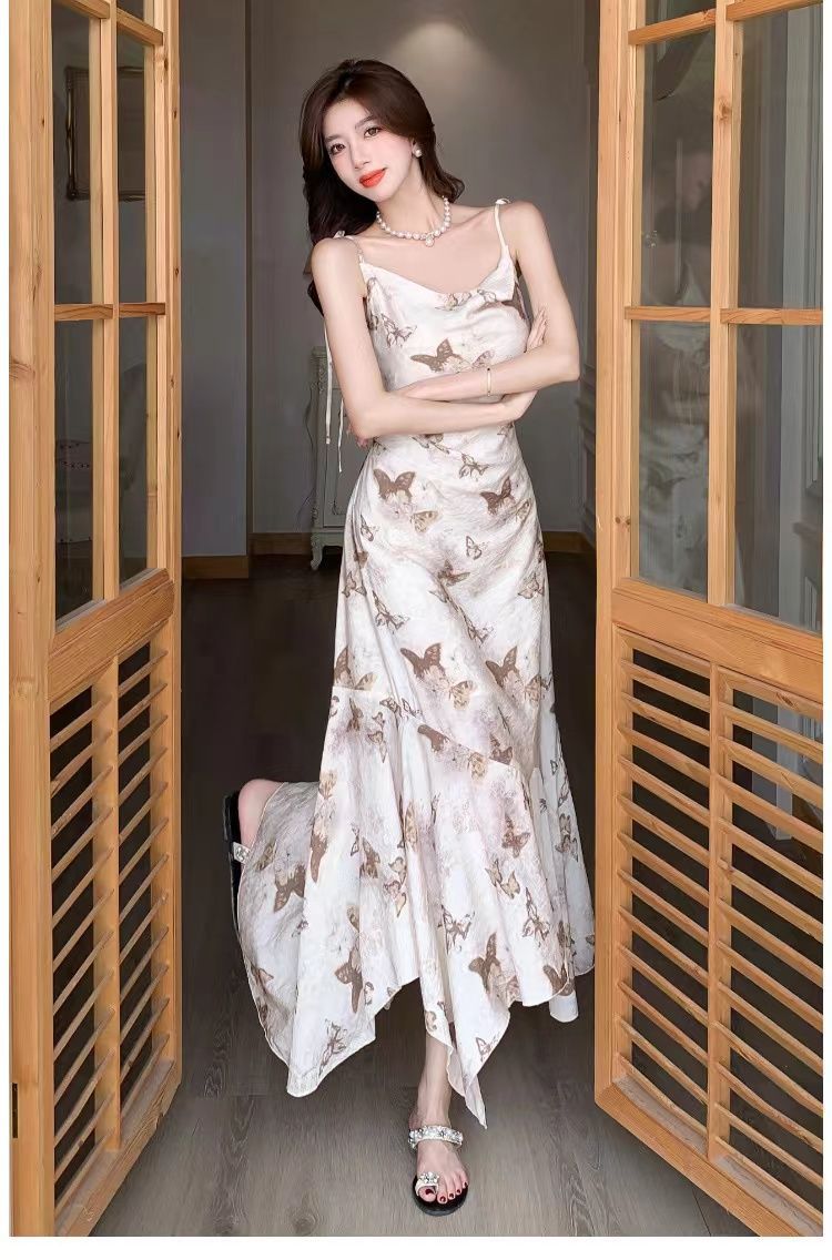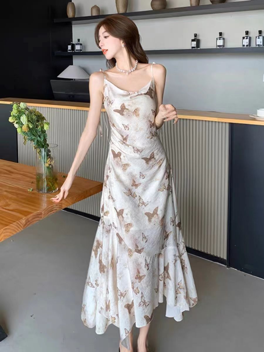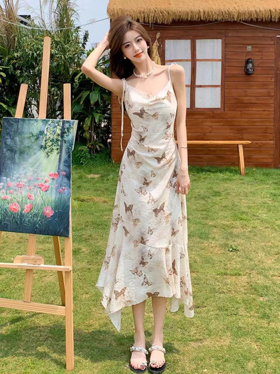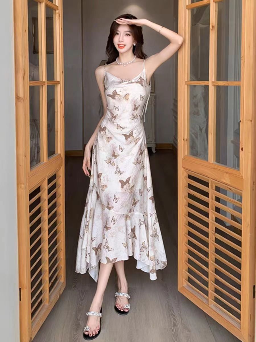 Butterfly Print Elegant Strap Dress for Women, Summer New French Style Off-Shoulder Fitted Slimming Vacation Medium-Length Dress